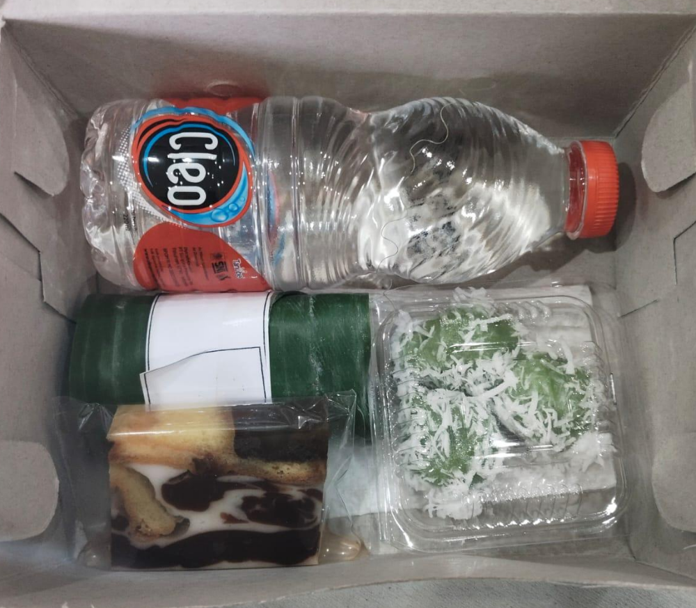 3 jenis snack (asin, manis), kacang dan air mineral