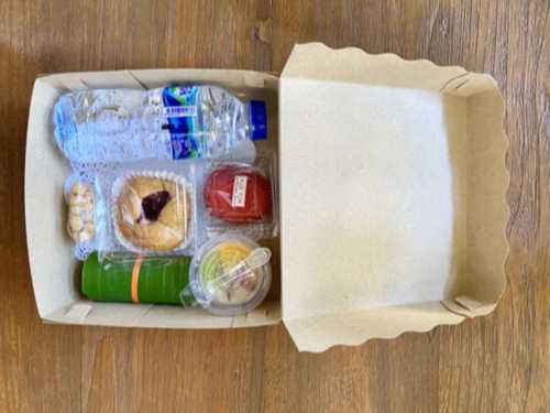 Snack Box berisi 3 Macam Snack (Tahu Bakso, Brownies, dan Pudding Buah), Air Mineral 330ml, dan Kacang.